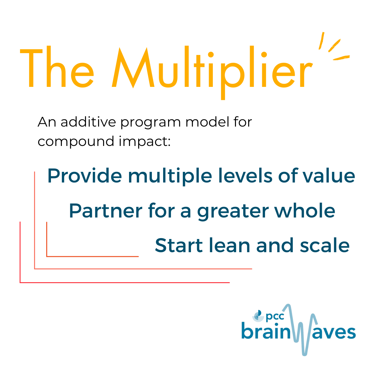 Like every social impact organization, we recognize there are limitless community challenges, and we can only bring finite resources to address them. To maximize our impact, we focus on ‘multipliers’: -